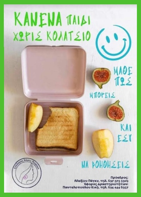 Μπορείτε να επικοινωνήσετε στα τηλέφωνα 6975755309 και 6944446957 για να μάθετε πώς μπορείτε να βοηθήσετε ή να κάνετε κατάθεση στον τραπεζικό λογαριασμό του Συλλόγου, με την αιτιολογία "Κανένα παιδί χωρίς κολατσιό