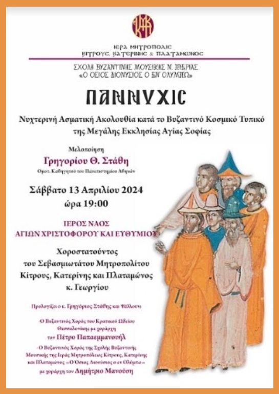 Ο Βυζαντινός Χορός της Σχολής Βυζαντινής Μουσικής της Ιεράς Μητροπόλεως Κίτρους «Όσιος Διονύσιος ο εν Ολύμπω» με χοράρχη τον κ. Δημήτριο Μανούση.