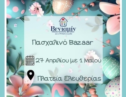 Το Bazaar του Συλλόγου μας θα πραγματοποιηθεί από το Σάββατο 27 Απριλίου έως και την Μ. Τετάρτη 01 Μαίου στην πλατεία Ελευθερίας