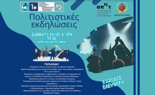Τις πολιτιστικές εκδηλώσεις θα πραγματοποιήσει ο Δήμος Κατερίνης & Αντιδημαρχία Πολιτισμού – Τουρισμού, το Σάββατο 25/05 & ώρα 19:30, στο Δημοτικό Θέατρο Πάρκου.