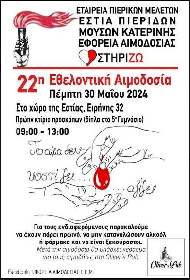 Την Πέμπτη 30 Μαϊου2024 στο χώρο της Ε.Π.Μ., στην οδό Ειρήνης 32 (Πλατεια Πολιτισμού 1), θα πραγματοποιηθεί η 22η Εθελοντική Αιμοδοσία του συλλόγου μας σε συνεργασία με το σύλλογο Γονέων και Κηδεμόνων Ατόμων με Αναπηρία Πιερίας ¨Στηρίζω¨, από τις 09:00 έως τις 13:00.