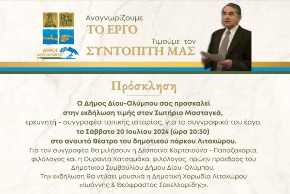 Στην τιμητική εκδήλωση του Σαββάτου 20 Ιουλίου θα μιλήσουν για τον συγγραφέα η κυρία Δέσποινα Καρτσιούνα-Παπαζαχαρία, φιλόλογος και η κυρία Ουρανία Κατσαμάκα, φιλόλογος, πρώην πρόεδρος του Δημοτικού Συμβουλίου Δήμου Δίου-Ολύμπου.