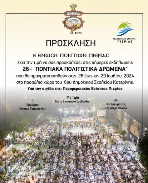 4ήμερες εκδηλώσεις τα 26α ¨ΠΟΝΤΙΑΚΑ ΠΟΛΙΤΙΣΤΙΚΑ ΔΡΩΜΕΝΑ¨ από τις 26 έως και 29 Ιουλίου 2024 στο γεμάτο πολιτισμό προαύλιο χώρο του 6ου Δημοτικού Σχολείου Κατερίνης.
