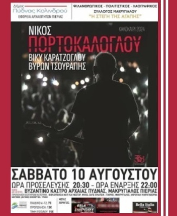 Η Συναυλία θα διεξαχθεί στα πλαίσια του φεστιβάλ Πολιτισμού και Παράδοσης, Πύδνεια 2024 ,στο Βυζαντινό κάστρο της Αρχαίας Πύδνας στο Μακρύγιαλο Πιερίας στις 10/08/2024 και ώρα 22:00
