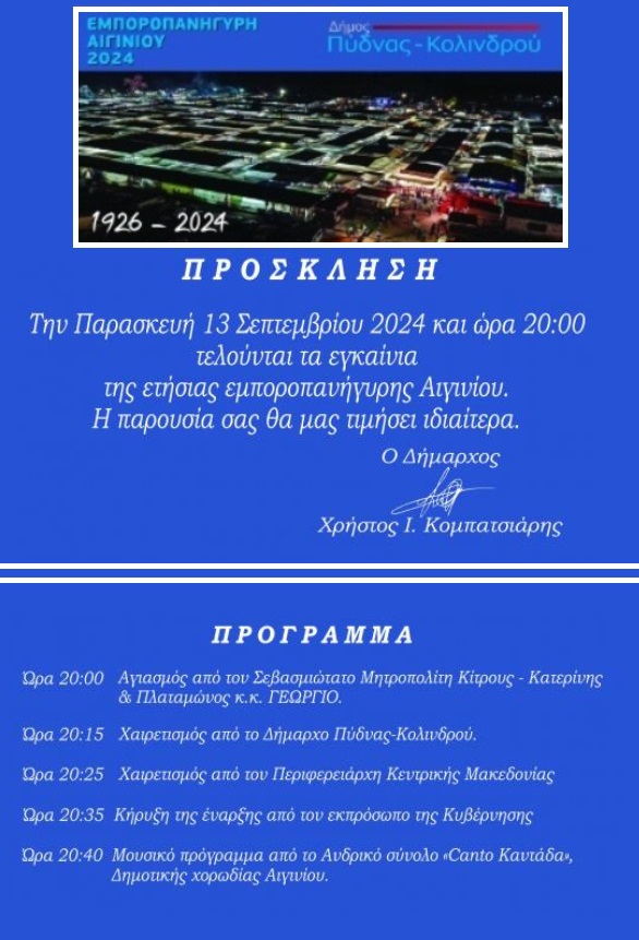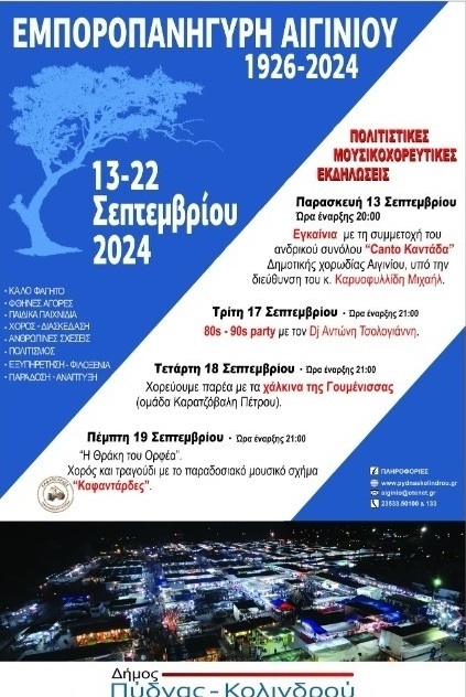 Η Εμποροπανήγυρη Αιγινίου ανοίγει τις πύλες της, με τα επίσημα εγκαίνιά της στις 13 Σεπτεμβρίου και διαρκεί ένα δεκαήμερο, έως 22 Σεπτεμβρίου 2024.