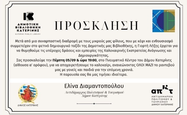Την Πέμπτη 5 Σεπτεμβρίου 2024 και ώρα 19:00 στο Πνευματικό Κέντρο του Δήμου Κατερίνης στην αίθουσα α' ορόφου η γιορτή λήξης της καλοκαιρινής εκστρατείας ανάγνωσης & δημιουργικότητας.