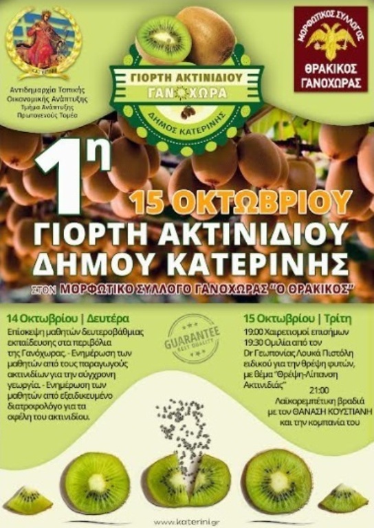 Η 1η Γιορτή Ακτινιδίου διοργανώνεται από την Αντιδημαρχία Τοπικής Οικονομικής Ανάπτυξης/Τμήμα Ανάπτυξης Πρωτογενούς Τομέα, με την υποστήριξη και συνεργασία του Μορφωτικού Συλλόγου Γανόχωρας «ΘΡΑΚΙΚΟΣ».