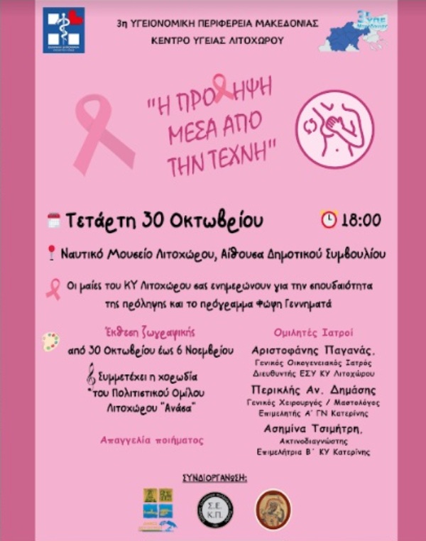 «Η πρόληψη μέσα από την τέχνη» την Τετάρτη 30 Οκτωβρίου 2024 (ώρα 18:00) στην αίθουσα συνεδριάσεων του Δημοτικού Συμβουλίου Δίου-Ολύμπου στο Λιτόχωρο (κτίριο Ναυτικού Μουσείου, οδός Αγίου Νικολάου 17, 1ος όροφος).