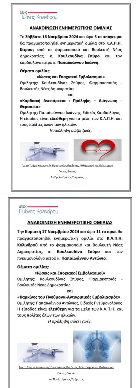 Ενημερωτικές ομιλίες στα ΚΑΠΗ Κίτρους και Κολινδρού Σάββατο 16 και την Κυριακή 17 Νοεμβρίου 2024