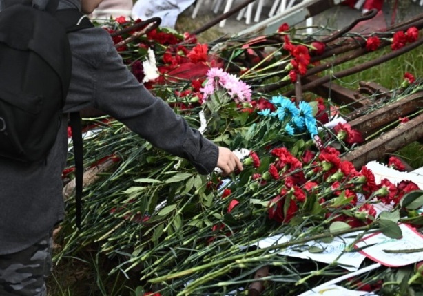 Πλήθος κόσμου αφήνει λουλούδια στο μνημείo.