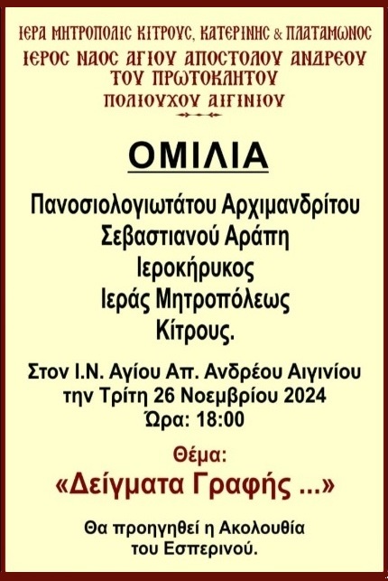 Την Τρίτη 26 Νοεμβρίου 2024, στον Ι.Ν. Αγίου Ανδρέα Αιγινίου, μετά την ακολουθία του Εσπερινού,  θα ακολουθήσει η ομιλία του Αρχιμανδρίτη Σεβαστιανού.