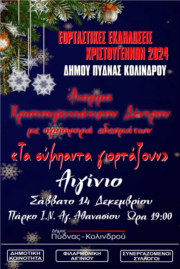 Την εκδήλωση “Τα σύμπαντα γιορτάζουν” θα την πλαισιώσουν με εορταστικά τραγούδια και ύμνους των Χριστουγέννων η φιλαρμονική Αιγινίου, η Δημοτική χορωδία Canto Olympus και η χορωδία του Ιερού Ναού Αγ. Ανδρέα.