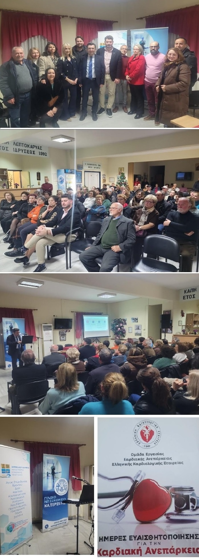 Η τέταρτη εκδήλωση, που πραγματοποιήθηκε στην αίθουσα του ΚΑΠΗ Λεπτοκαρυάς, είχε θέμα την καρδιακή ανεπάρκεια και τη στεφανιαία νόσo, και πραγματοποιήθηκε υπό την αιγίδα του Ιατρικού Συλλόγου Πιερίας.