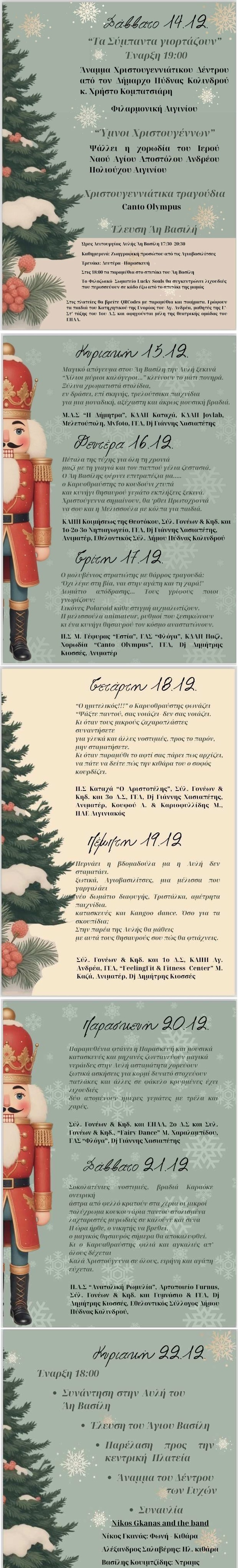 Ακολουθείσθε το πρόγραμμα της αυλής του Άη Βασίλη, χαρείτε κάθε ημέρα, στο πάρκο του Αγίου Αθανασίου για τα φετινά Χριστούγεννα στο Αιγίνιο Πιερίας.