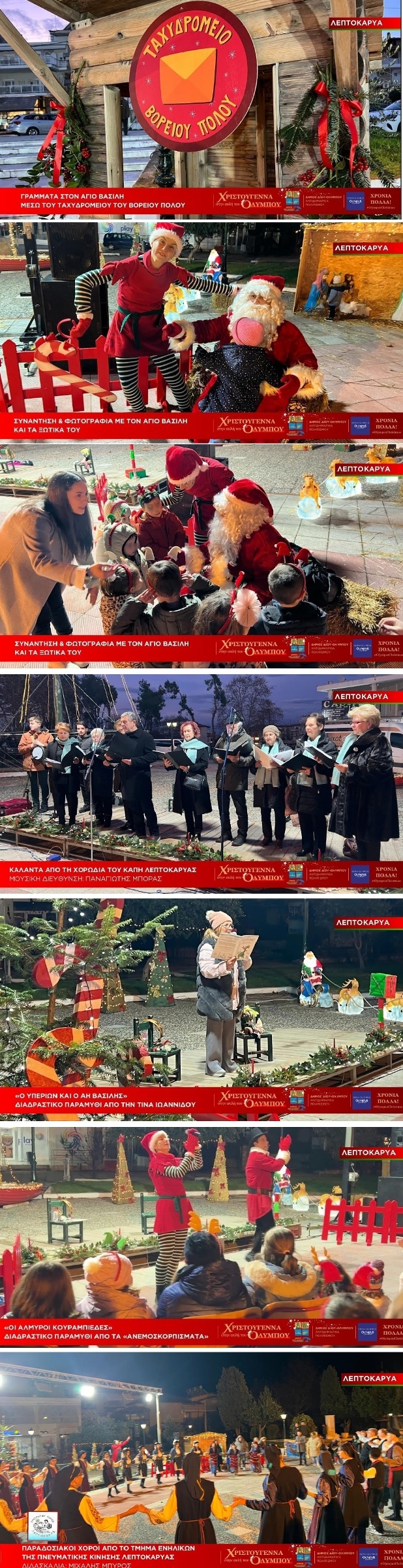 Η πρεμιέρα των «Χριστουγέννων στην αυλή του Ολύμπου» έγινε στην πλατεία της Λεπτοκαρυάς, το απόγευμα του Σαββάτου, με κάλαντα από τη χορωδία του ΚΑΠΗ Λεπτοκαρυάς, σε μουσική διεύθυνση Παναγιώτη Μπόρα.