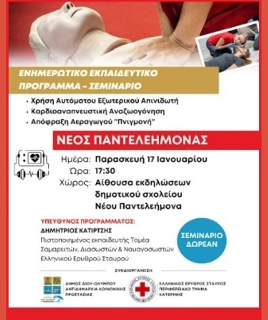 Στην αίθουσα εκδηλώσεων του δημοτικού σχολείου Νέου Παντελεήμονα συνεχίζει ο κύκλος του δωρεάν ενημερωτικού-εκπαιδευτικού προγράμματος για τη χρήση αυτόματου εξωτερικού απινιδωτή, την καρδιοαναπνευστική αναζωογόνηση και την απόφραξη αεραγωγού «Πνιγμονή», την Παρασκευή 17 Ιανουαρίου 2025 στις 17:30.