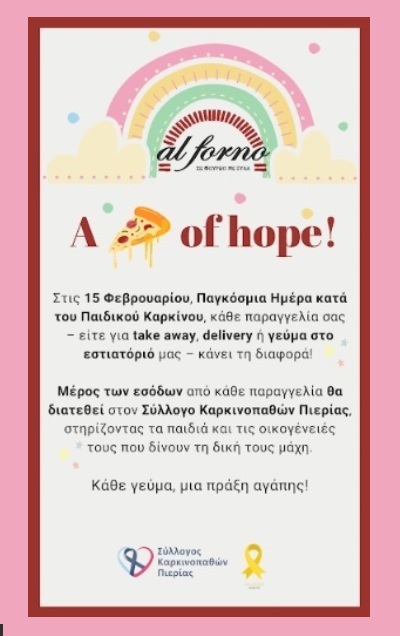 Στο πλαίσιο αυτό, το Σάββατο 15 Φεβρουαρίου 2025, η πιτσαρία Al Forno θα διαθέσει μέρος των εσόδων της στον Σύλλογο Καρκινοπαθών Πιερίας για την παροχή φροντίδας και υποστήριξης σε παιδιά και οικογένειες που νοσούν από καρκίνο.