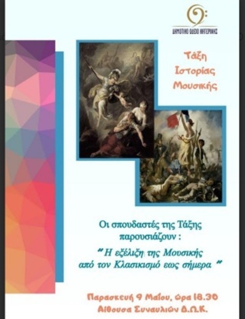 Το Δημοτικό Ωδείο Κατερίνης προσκαλεί το κοινό στην εκδήλωση που παρουσιάζουν οι σπουδαστές της Τάξης Ιστορίας Μουσικής, με θέμα «Η εξέλιξη της Μουσικής από τον Κλασικισμό έως σήμερα», την Παρασκευή 9 Μαΐου 2025 και ώρα 18:30 στην Αίθουσα Συναυλιών του Δ.Ω.Κ.