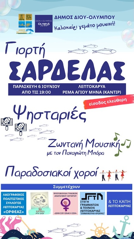 Το σήμα εκκίνησης του φετινού κύκλου καλοκαιρινών εκδηλώσεων του Δήμου Δίου-Ολύμπου «Καλοκαίρι γεμάτο μουσική» θα δοθεί στο μεγάλο γλέντι, με ζωντανή μουσική από τον βιρτουόζο του παραδοσιακού κλαρίνου, Παναγιώτη Μπόρα, σαρδέλες ψητές σε ψησταριές που θα ανάψουν από νωρίς και παραδοσιακούς χορούς.