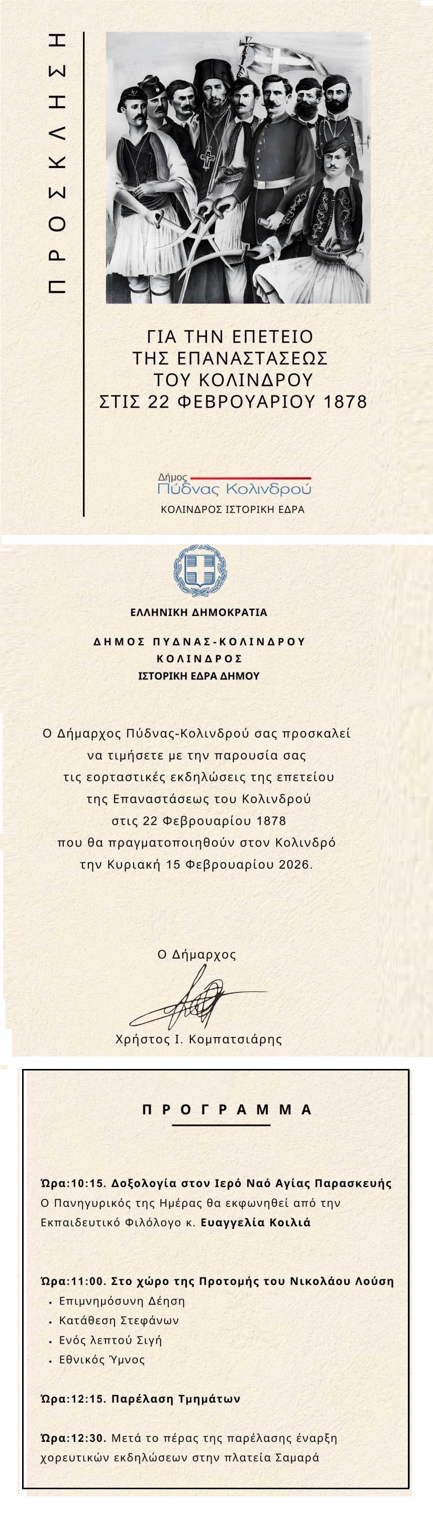 AIGINIONEWS: Δήμος Πύδνας-Κολινδρού: Eορταστικές εκδηλώσεις για την Επανάσταση του Κολινδρού - 15/2/2026