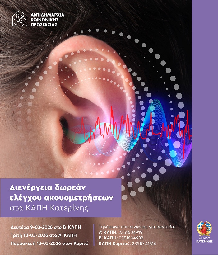 AIGINIONEWS: Δήμος Κατερίνης: Διενέργεια δωρεάν ελέγχου ακουομετρήσεων στα ΚΑΠΗ -9/3/2026 AIGINIONEWS: Δήμος Κατερίνης: Διενέργεια δωρεάν ελέγχου ακουομετρήσεων στα ΚΑΠΗ -9/3/2026