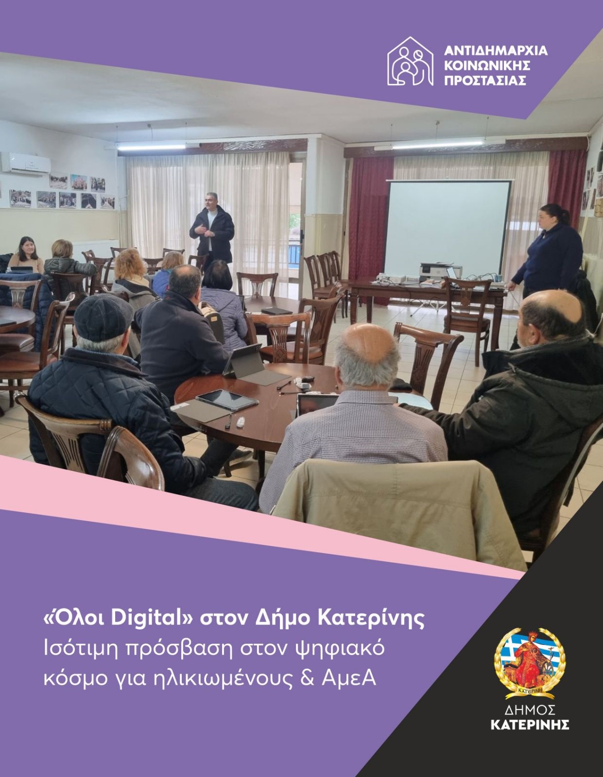 Ο λόγος για το πρόγραμμα «Όλοι Digital», που με μεγάλη ανταπόκριση υλοποιείται από την αντιδημαρχία Κοινωνικής Προστασίας ενώ θέτει ως στόχο την ενίσχυση των ψηφιακών δεξιοτήτων των εκπαιδευομένων.