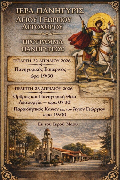 Το πρόγραμμα της πανηγύρεως του Ιερού Ναού Αγίου Γεωργίου Λιτοχώρου Τετάρτη 22 & Πέμπτη 23 Απριλίου 2026