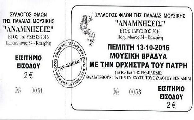Ο Σύλλογος Φίλων της Παλαιάς Μουσικής "Αναμνήσεις" διοργανώνει την Πέμπτη 13/10/2016 και ώρα 21.00 μια υπέροχη μουσική βραδυά με τη συμμετοχή της Ορχήστρας του Νίκου Πατρή. Τα έσοδα της εκδήλωσης θα διατεθούν για την ενίσχυση του Συλλόγου Προστασίας Παιδιών ΒΕΝΙΑΜΙΝ.