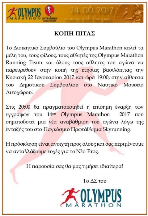Σας προσκαλούμε στην κοπή της πρωτοχρονιάτικης πίτας του Olympus Marathon 2017. Η παρουσία σας θα μας τιμήσει ιδιαίτερα!
