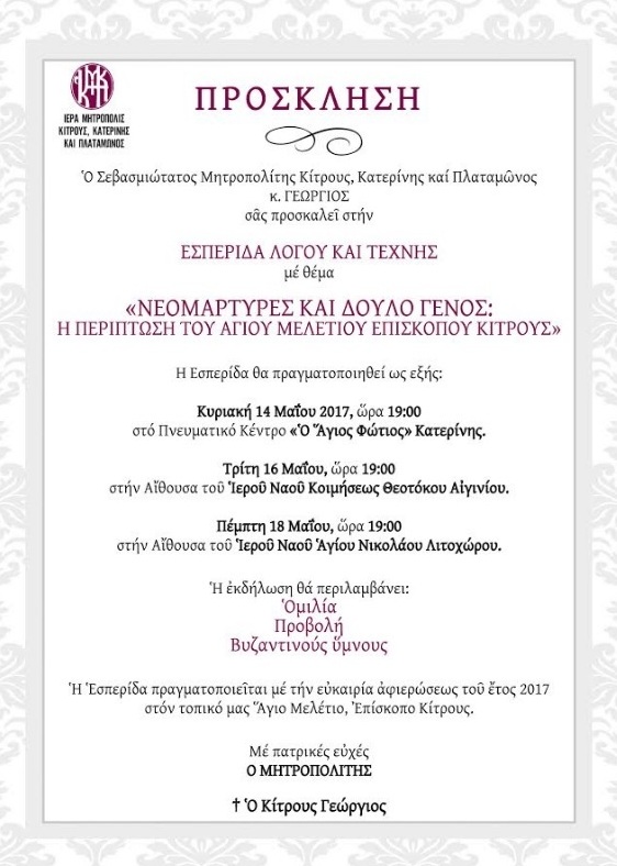 Με την ευκαιρία αυτή, η Ιερά Μητρόπολη θα πραγματοποιήσει Εσπερίδα λόγου και τέχνης την Κυριακή 14 Μαΐου και ώρα 7μ.μ. στο Πνευματικό Κέντρο «Ο ΑΓΙΟΣ ΦΩΤΙΟΣ», με θέμα: «Νεομάρτυρες και δούλο Γένος: Η περίπτωση του Αγίου Μελετίου Επισκόπου Κίτρους».