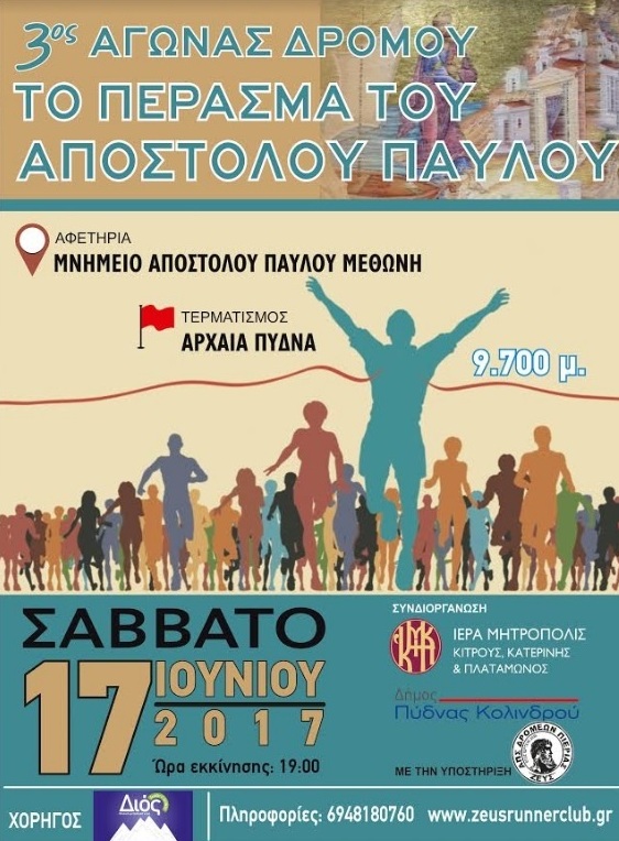 ΠΑΡΑΛΑΒΗ ΑΡΙΘΜΩΝ: Ο σύλλογος θα ανοίξει τα γραφεία του (Ρούπελ και Διγενή Ακρίτα, Κατερίνη) την Παρασκευή 16 Ιουνίου 2017 από τις 14.30 έως τις 17.30 για να δίνει σε αθλητές που κατάγονται από την περιοχή της Πιερίας και μέλη του συλλόγου προκειμένου να παραλάβουν τους αριθμούς τους. Οι υπόλοιποι θα τα παραλαμβάνουν από την γραμματεία η οποία θα λειτουργεί μόνον στο σημείο τερματισμού – Αρχαία Πύδνα- από τις 14.30 έως μέχρι τις 17.30