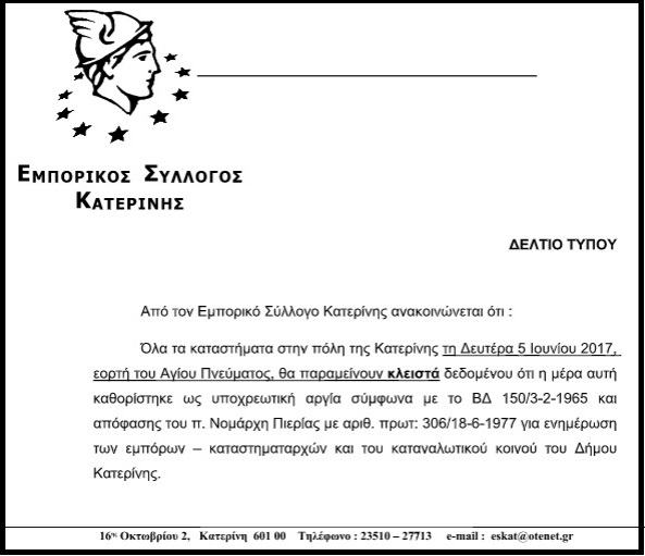 Όλα τα καταστήματα στην πόλη της Κατερίνης τη Δευτέρα 5 Ιουνίου 2017, εορτή του Αγίου Πνεύματος, θα παραμείνουν κλειστά δεδομένου ότι