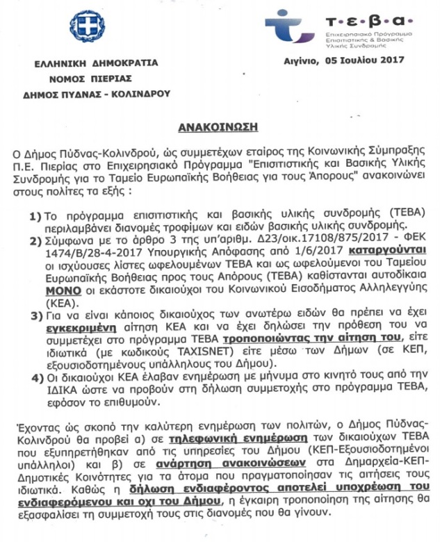 Ανακοίνωση του Δήμου Πύδνας Κολινδρού για δικαιούχους ΤΕΒΑ.