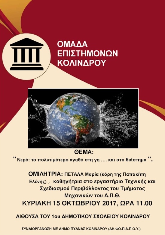 στην Αίθουσα του 1ου Δημοτικού Σχολείου Κολινδρού, εκδήλωση με ομιλήτρια την κ. Πεταλά Μαρία (κόρη της Ελένης Παπακίπη, με καταγωγή από τον Κολινδρό), καθηγήτρια στο Εργαστήριο Τεχνικής και Σχεδιασμού Περιβάλλοντος του Τμήματος Πολιτικών Μηχανικών του ΑΠΘ.