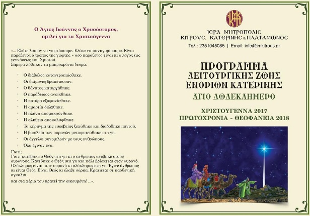 · Την ίδια ημέρα, 6.00-8.00 το απόγευμα, θα χοροστατήσει στον Πανηγυρικό Εσπερινό των Χριστουγέννων, στον Ιερό Καθεδρικό Ναό Θείας Αναλήψεως Κατερίνης.