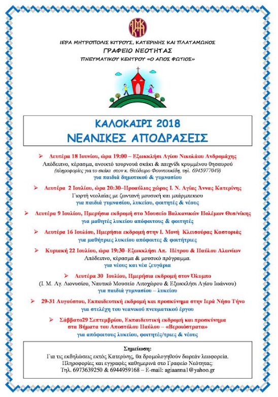 Για δηλώσεις συμμετοχής και πληροφορίες μπορείτε να επικοινωνήσετε με τον Υπεύθυνο του Γραφείου Νεότητας Αρχιμανδρίτη π. Διονύσιο Γκόλια στο τηλέφωνο 6944959168 και στην ηλεκτρονική διεύθυνση Αυτή η διεύθυνση ηλεκτρονικού ταχυδρομείου προστατεύεται από τους αυτοματισμούς αποστολέων ανεπιθύμητων μηνυμάτων. Χρειάζεται να ενεργοποιήσετε τη JavaScript για να μπορέσετε να τη δείτε..