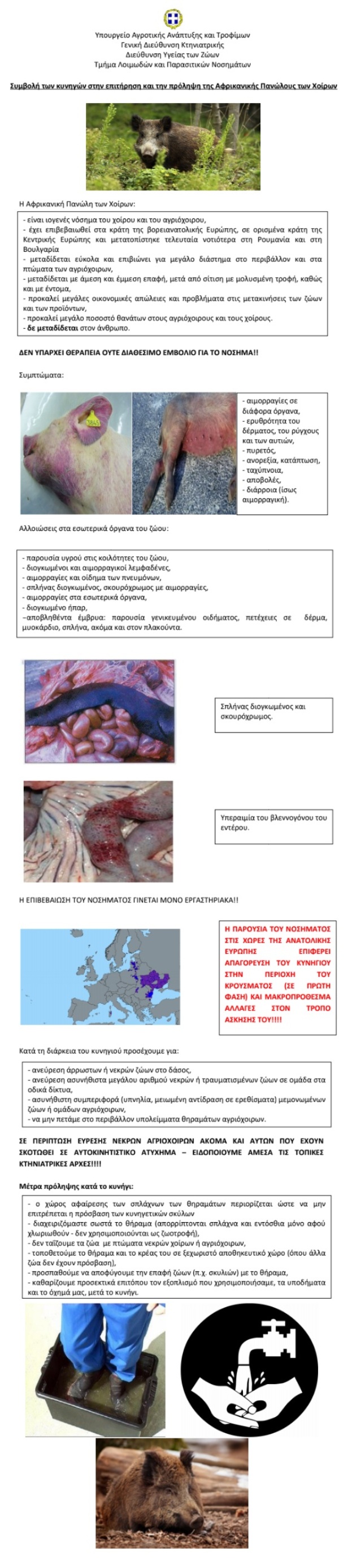 - Οι κυνηγοί που δραστηριοποιούνται σε άλλες χώρες να είναι ιδιαίτερα προσεκτικοί και να λαμβάνουν όλα τα απαραίτητα μέτρα (διαχείριση θηραμάτων και υποπροϊόντων αυτών, καθαρισμός και απολύμανση οχημάτων και εξοπλισμού) για την αποφυγή εισόδου του νοσήματος.