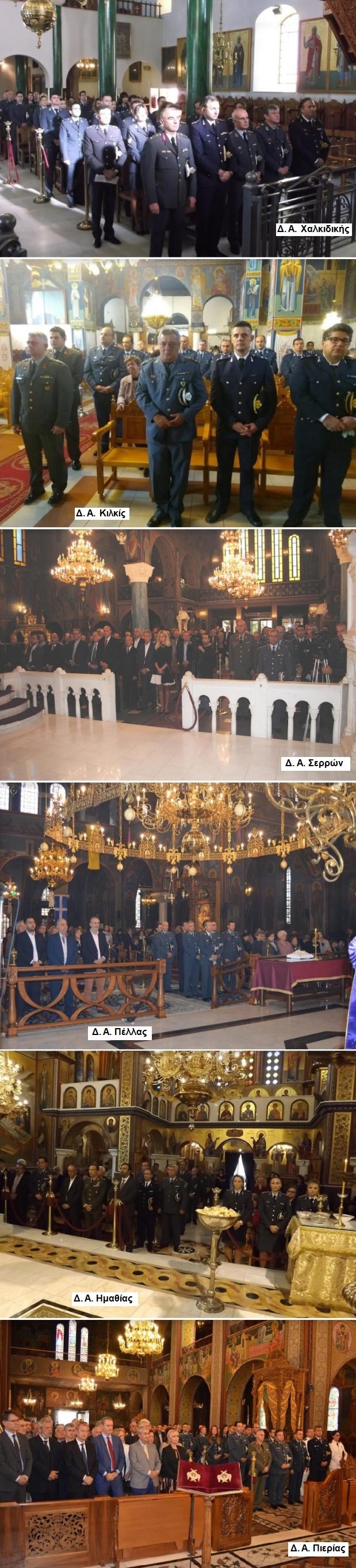Στις έδρες των Διευθύνσεων Αστυνομίας Ημαθίας, Κιλκίς, Πέλλας, Πιερίας, Σερρών και Χαλκιδικής, τελέστηκε σήμερα το πρωί δοξολογία σε Ιερούς Ναούς, στις οποίες παραβρέθηκαν εκπρόσωποι των Θρησκευτικών, Πολιτικών, Δικαστικών και Στρατιωτικών Αρχών, εκπρόσωποι των φορέων της τοπικής αυτοδιοίκησης, εκπρόσωποι των ενώσεων αποστράτων, συνδικαλιστικοί φορείς, καθώς και εκπρόσωποι των Μ.Μ.Ε., ενώ παράλληλα αναγνώστηκε η Ημερήσια Διαταγή του Αρχηγού της Ελληνικής Αστυνομίας Αντιστράτηγου Αριστείδη Ανδρικόπουλου.
