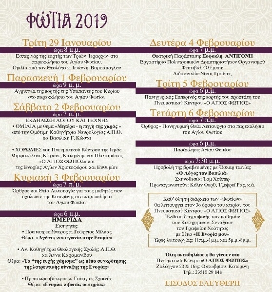 Ο Σεβασμιώτατος Μητροπολίτης κ. Γεώργιος, με αφορμή τη διοργάνωση της ημερίδας, δήλωσε χαρακτηριστικά «ότι τα Φώτια αποτελούν και φέτος σημείο αναφοράς για την Ορθοδοξία και τον πολιτισμό με ένα θέμα όπως ο ρόλος της Ενορίας που είναι πιο επίκαιρο από ποτέ. Η ημερίδα θα μας δώσει τη δυνατότητα να ανακαλύψουμε τον σπουδαίο ρόλο της Ενορίας και να μας καταστήσει κοινωνούς του αυθεντικού βιώματος και της διδασκαλίας της Αγίας Εκκλησίας του Χριστού σε σχέση με τον βασικό αυτό θεσμό».