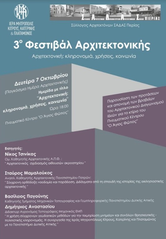 H Iερά Μητρόπολη Κίτρους, Κατερίνης και Πλαταμώνος και ο Σύλλογος Αρχιτεκτόνων ΣΑΔΑΣ Ν. Πιερίας, με αφορμή την Παγκόσμια Ημέρα Αρχιτεκτονικής που γιορτάζεται κάθε πρώτη Δευτέρα Οκτωβρίου, διοργανώνουν το Η Παγκόσμια Ημέρα Αρχιτεκτονικής γιορτάζεται κάθε χρόνο την πρώτη Δευτέρα του Οκτωβρίου με πολλές εκδηλώσεις αρχιτεκτονικού περιεχομένου, ανά τον κόσμο.