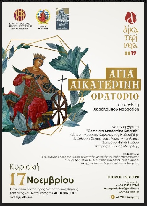 Αξίζει να σημειωθεί, ότι, ένα πολυδιάστατο πλέγμα εκδηλώσεων ανοικτών σε όλους, που συνδυάζουν αρμονικά την παραδοσιακή, με την σύγχρονη καλλιτεχνική δραστηριότητα και έκφραση, ενώ θέτουν στο επίκεντρο τις δημιουργικές φωνές και το καλλιτεχνικό δυναμικό της ευρύτερης περιοχής αγκαλιάζουν φέτος τα «ΑΙΚΑΤΕΡΙΝΕΙΑ», που σε όλη τη διάρκεια του Νοεμβρίου διοργανώνονται από τον Οργανισμό Πολιτισμού (ΟΠΠΑΠ) του Δήμου Κατερίνης, υπό την αιγίδα της Ιεράς Μητροπόλεως Κίτρους, Κατερίνης και Πλαταμώνος.