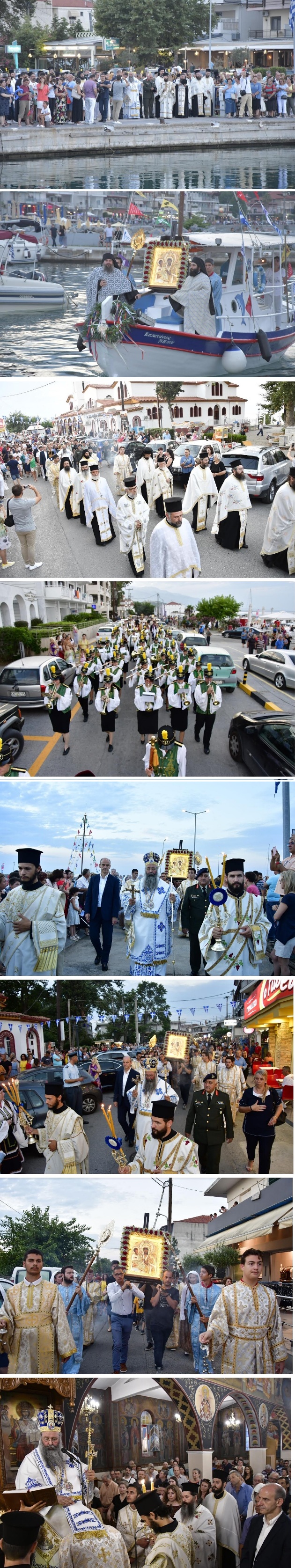 Η Ιερά Εικόνα κατέφθασε με ειδικό πλοιάριο, συνοδευόμενο και από άλλα πλωτά μέσα και αλιευτικά σκάφη. Την υποδέχθηκε ο Σεβασμιώτατος Μητροπολίτης Κίτρους, Κατερίνης και Πλαταμώνος κ. Γεώργιος συμπαραστατούμενος απο κληρικούς της Ιεράς Μητροπόλεως.