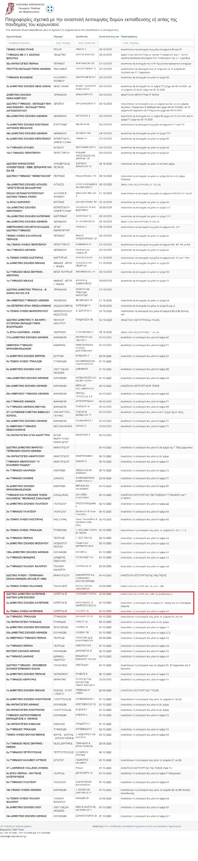 Αυτή είναι η λίστα με τα σχολεία ή τα τμήματα που αναστέλλουν τη λειτουργία τους