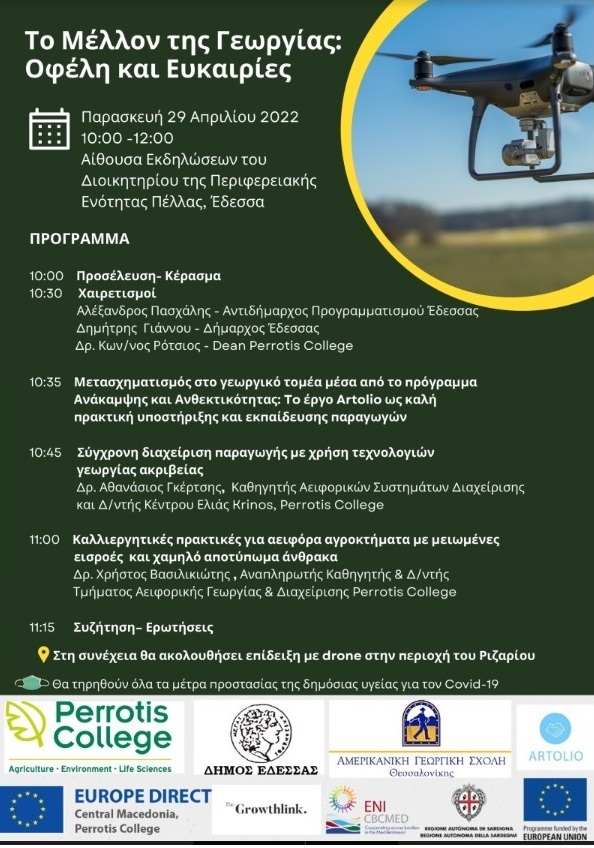Στην εκδήλωση θα γίνει αναφορά στο μετασχηματισμό του αγροτικού τομέα μέσα από το πρόγραμμα ανάκαμψης και ανθεκτικότητας και παρουσίαση του έργου Artolio ως καλή πρακτική υποστήριξης και εκπαίδευσης παραγωγών.