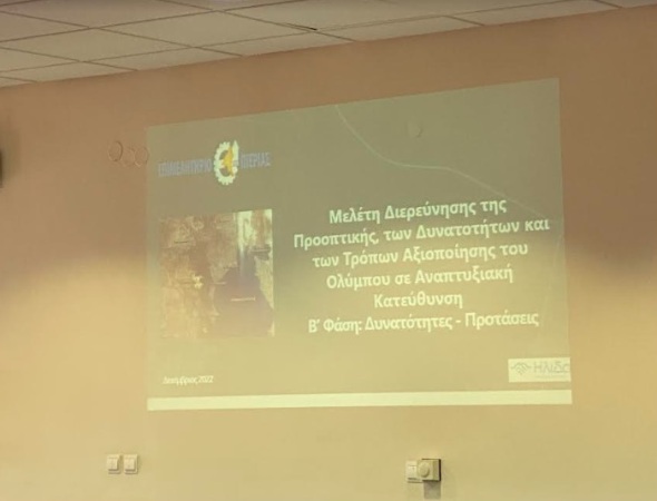 Συγκεκριμένα οι εκπρόσωποι της μελετητικής εταιρείας παρουσίασαν τη β΄ φάση της έρευνας στο πλαίσιο της οποίας αναπτύσσονται οι δυνατότητες και οι προοπτικές αξιοποίησης του μυθικού βουνού προς όφελος της παρολύμπιας περιοχής αλλά και όλης της χώρας.