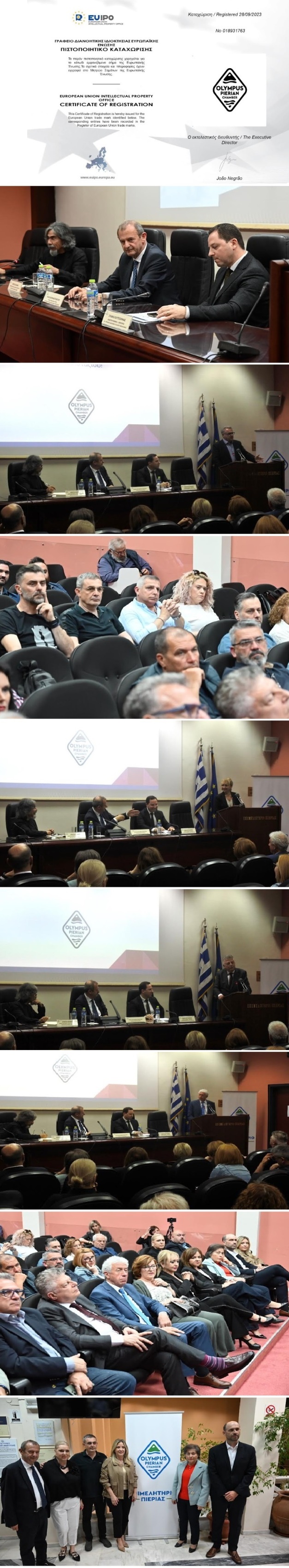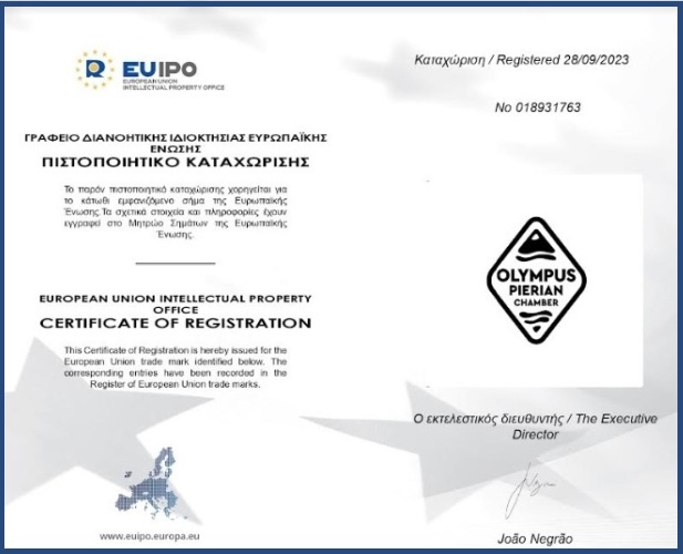 Συνεχίζοντας, αναφέρθηκε στην επίπονη και χρονοβόρα διαδικασία που ακολουθήθηκε από τη δημιουργία του λογοτύπου, την κατάθεση της αίτησης για τη νομική κατοχύρωση, τις ανακοπές και ενστάσεις που προέκυψαν και ξεπεράστηκαν, έως τον Αύγουστο του 2023 όταν κατοχυρώθηκε το Ευρωπαϊκό Συλλογικό Εμπορικό Σήμα “Olympus Pierian Chamber”, υπέρ της Πιερίας και της Ελλάδας σε πανευρωπαϊκό επίπεδο, από το Γραφείο Διανοητικής Ιδιοκτησίας της Ευρωπαϊκής Ένωσης που εδρεύει στην Alicante της Ισπανίας.