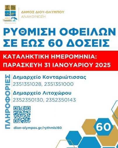 Μπορείτε να διαβάσετε αναλυτικές πληροφορίες για τη νέα ρύθμιση στην ιστοσελίδα του Δήμου Δίου-Ολύμπου https://www.dion-olympos.gr/rythmisi60/ ή επικοινωνώντας στα τηλέφωνα: