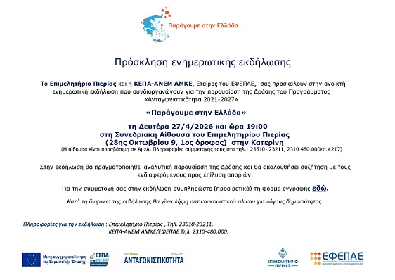 τη Δευτέρα 27/4/2026 και ώρα 19:00 στη Συνεδριακή Αίθουσα (1 ος όροφος) του Επιμελητηρίου Πιερίας.
