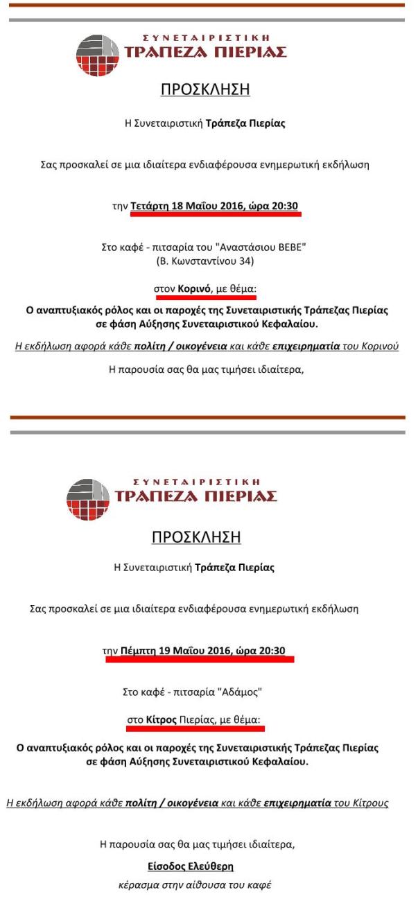 ΣΥΝΕΤΑΙΡΙΣΤΙΚΗ ΤΡΑΠΕΖΑ ΠΙΕΡΙΑΣ - ΠΡΟΣΚΛΗΣΕΙΣ