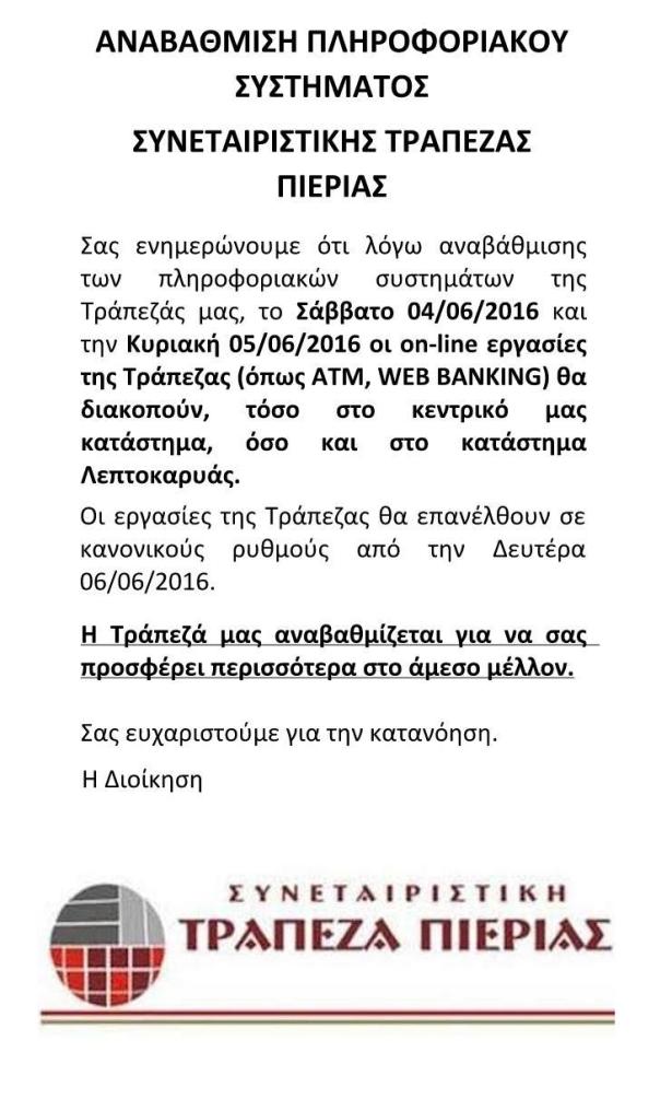 ΣΥΝΕΤΑΙΡΙΣΤΙΚΗ ΤΡΑΠΕΖΑ ΠΙΕΡΙΑΣ - ΑΝΑΒΑΘΜΙΣΗ ΠΛΗΡΟΦΟΡΙΑΚΟΥ ΣΥΣΤΗΜΑΤΟΣ 4 έως 6 ΙΟΥΝΙΟΥ